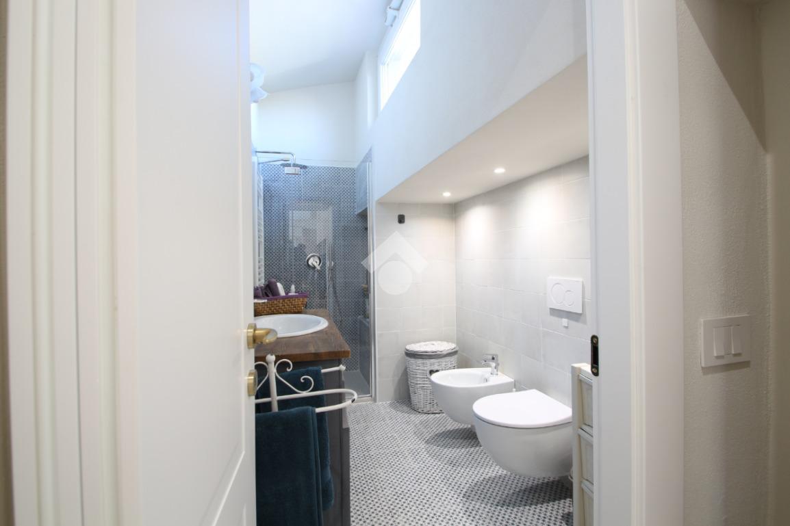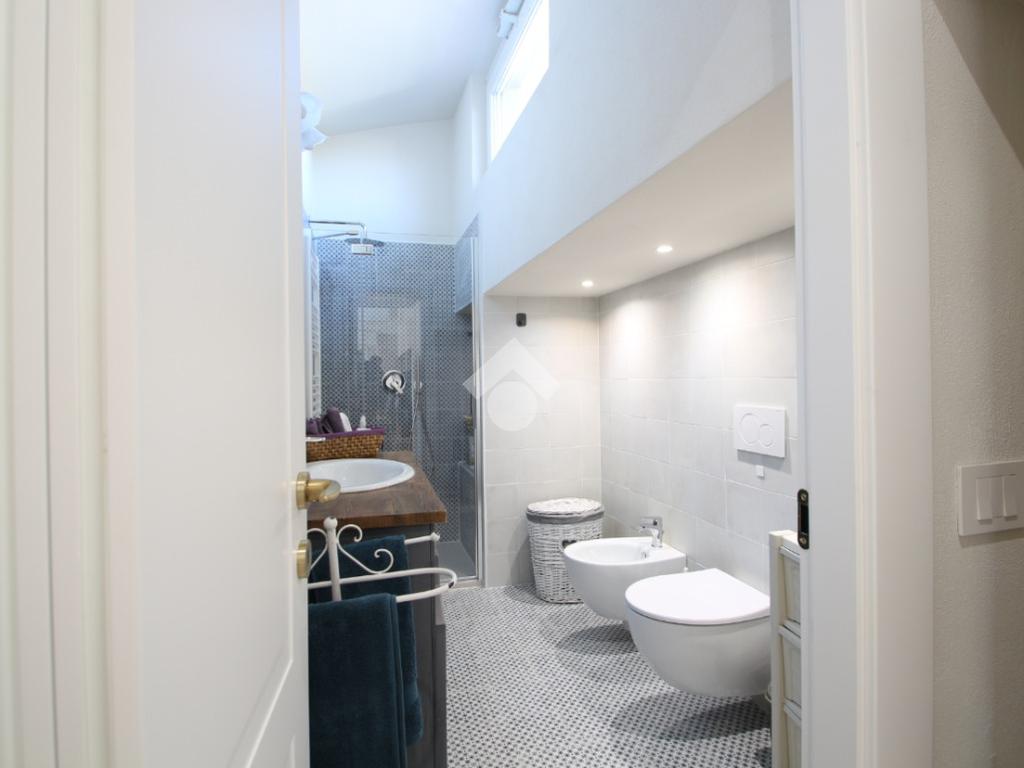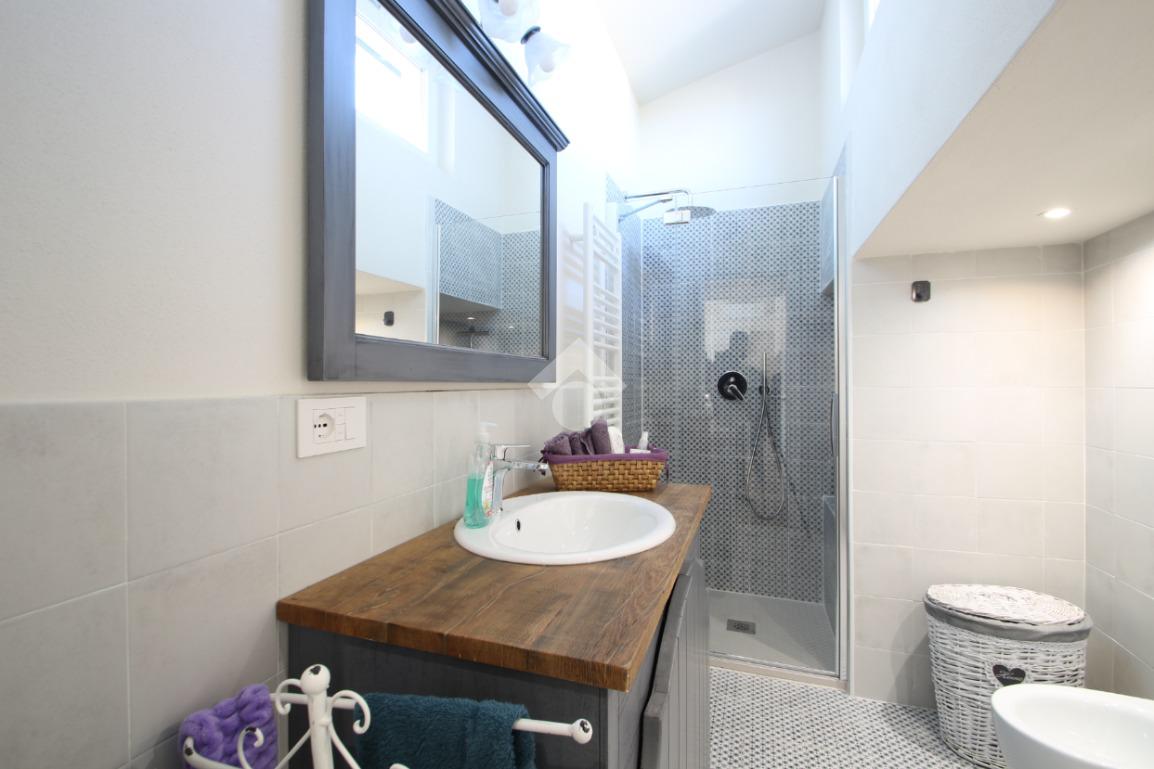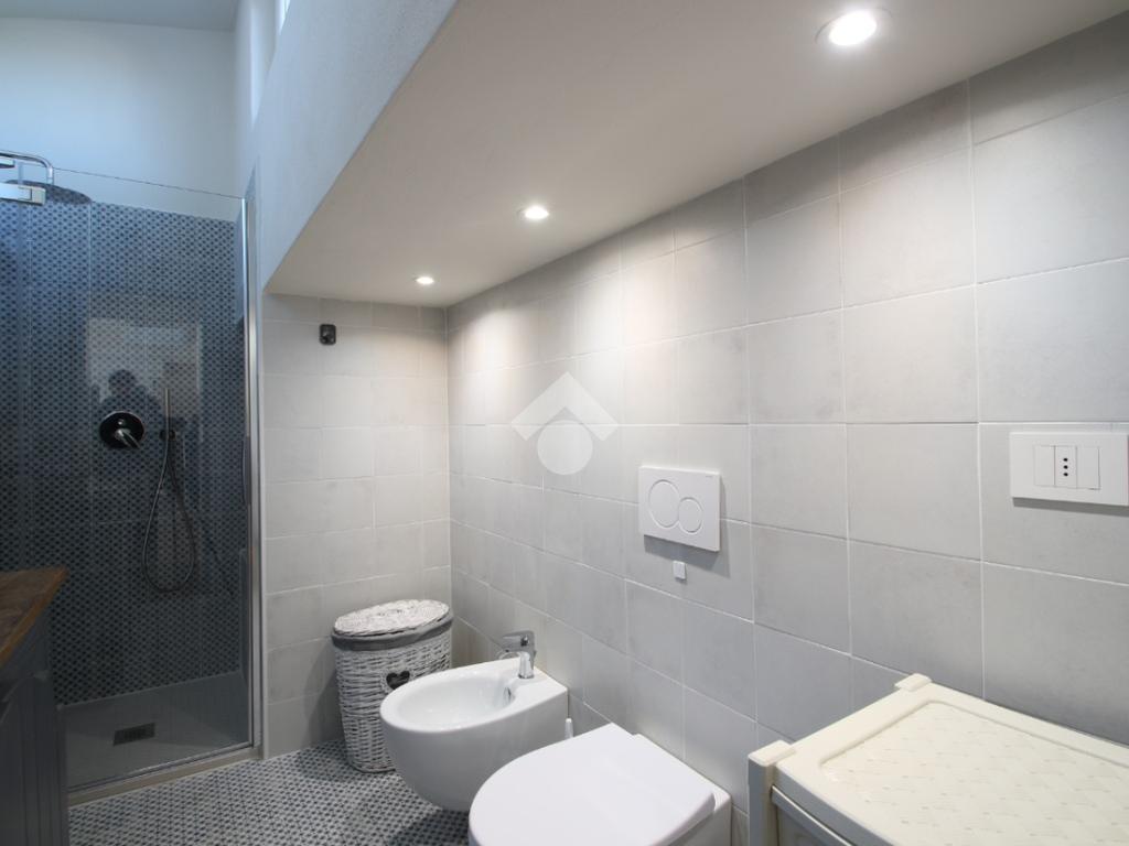 Accanto a questa camera troviamo il bagno dotato di box doccia con anta in vetro e nicchia al suo interno. Illuminazione a led sopra i sanitari sospesi e finestra a soffitto apribile elttricamente garantiscono ottima luminosità e aerazione a tutto l'ambiente.