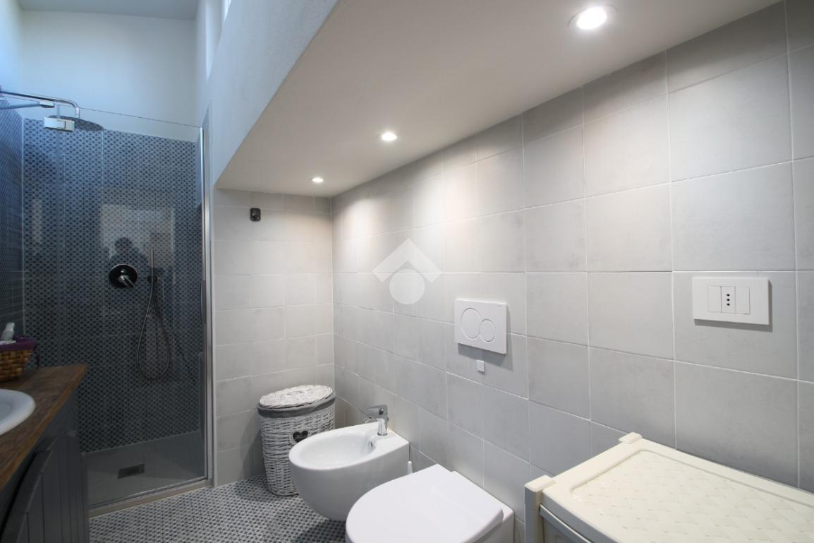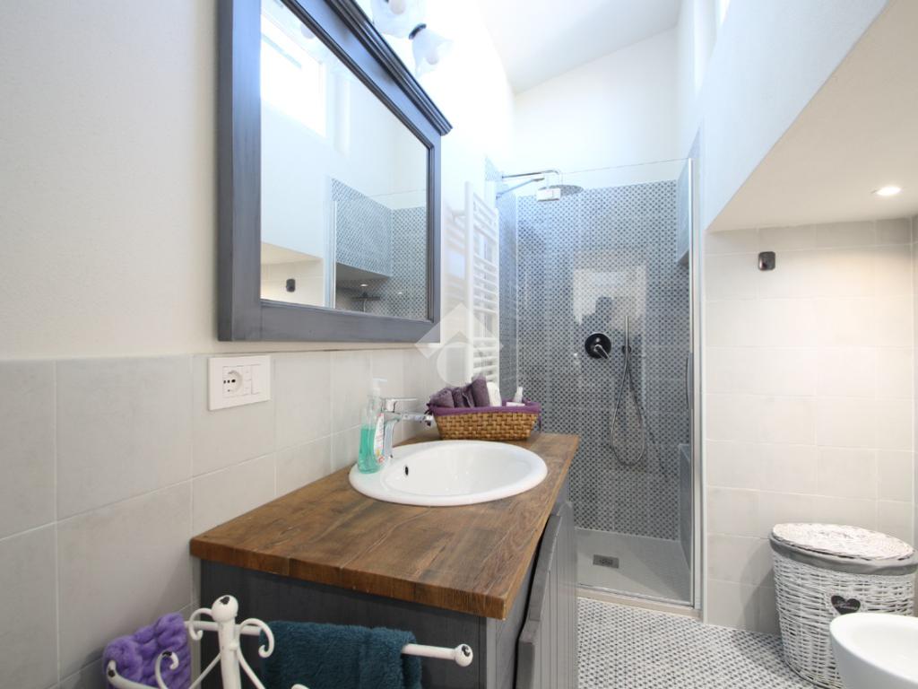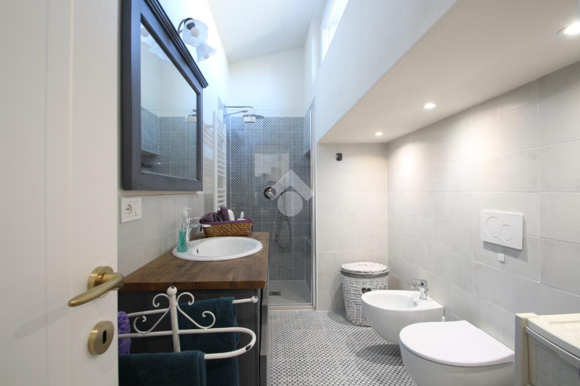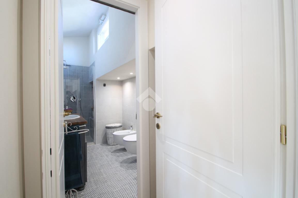 Accanto a questa camera troviamo il bagno dotato di box doccia con anta in vetro e nicchia al suo interno. Illuminazione a led sopra i sanitari sospesi e finestra a soffitto apribile elttricamente garantiscono ottima luminosità e aerazione a tutto l'ambiente.